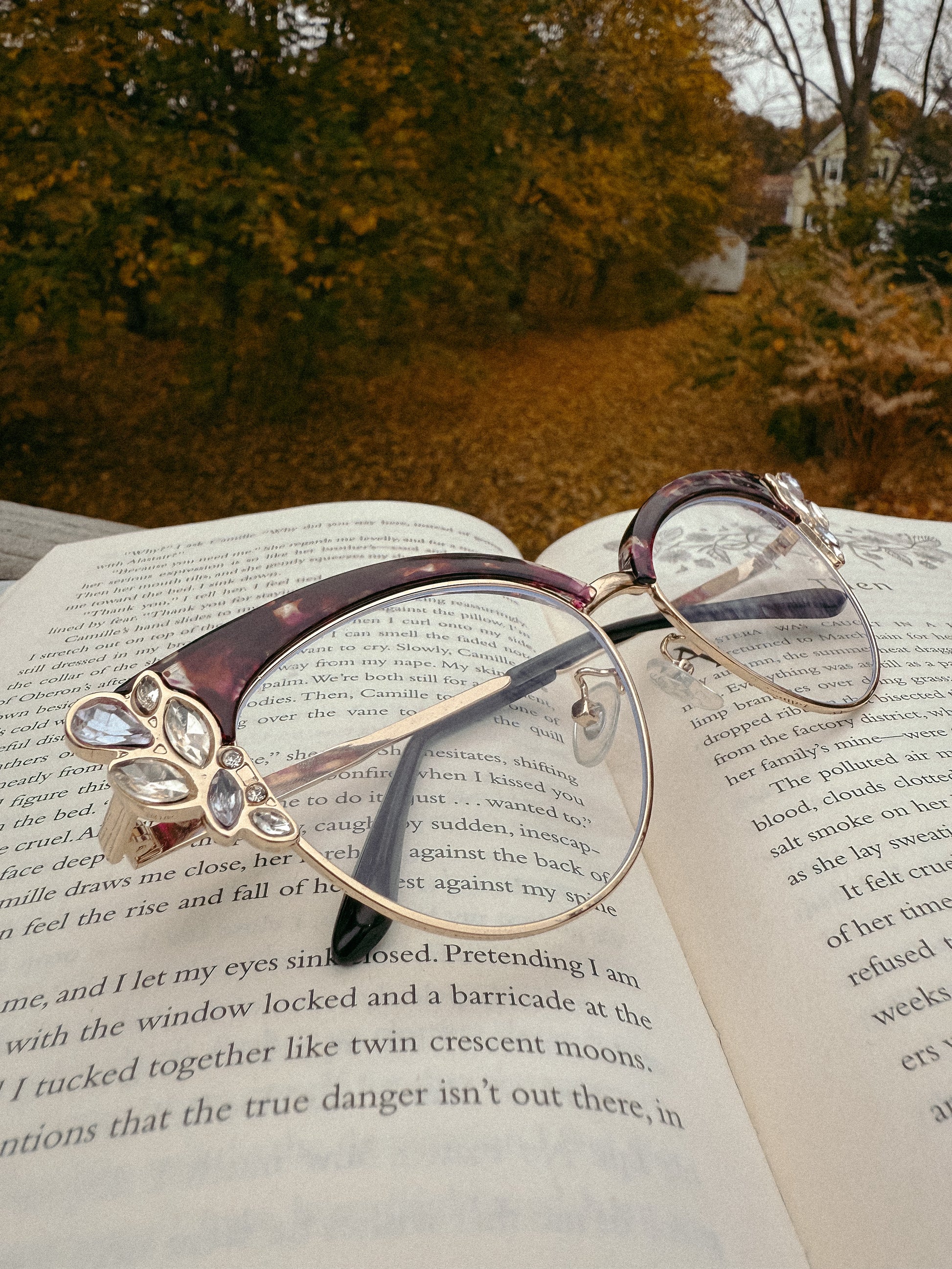 I've used presets and editing that best show the natural colors of the glasses- these are a purple and brown tortoiseshell cat-eye, with gems at the outer apex of the cat eye & gold lower frames.