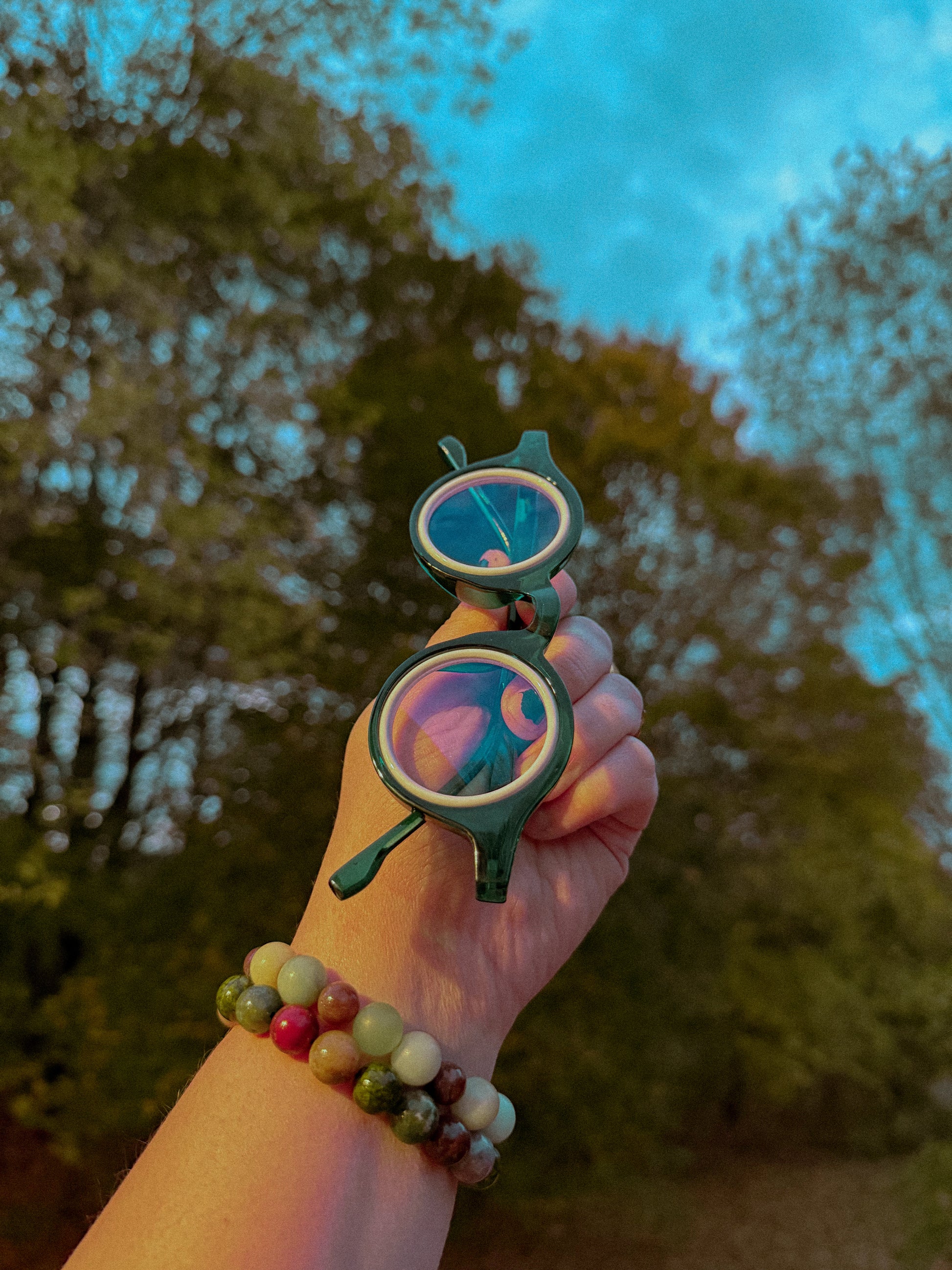 I've used presets and editing that best show the natural colors of the glasses- these are a dual-colored acetate frame with an inner ring of white & dark, translucent teal outer ring & full frame.